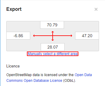 Once a aria have been selected you can download it by pressing the Export button, in the case of larger arias the Export button will not be visible and you will instead be directed to use one of the alternative sources, Overpass API is recomended due to ease of use.
