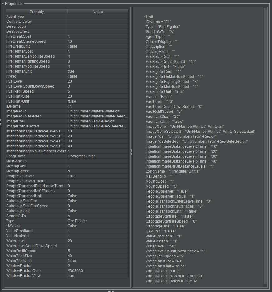 This panel is split into two sections. The left-hand side displays Unit configuration properties and values, in tabular format. The right-hand side displays the corresponding XML. The information in this panel updates as changes are made in the panels above.