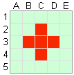 10 seconds after C3 starts burning the fire spreads from cell C3 to cell B3, C2, C4 and D3. |