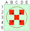 14 seconds after C2 starts burning the fire spreads from cell C2 to cell B1 and D1, etc. |