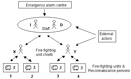 typical hierarchical emergency organisation. The layers are the emergency alarm center, the command and control staff, the fire-fighting unit chiefs and the ground units.