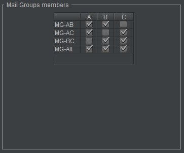 - In this example the player can send mail to 'A' and 'B', and to mailgrop 'AB' and mail group 'All'.