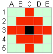 14 seconds after C3 starts burning the fire spreads from cell C3 to cell B2, D2, B4 and D4. |