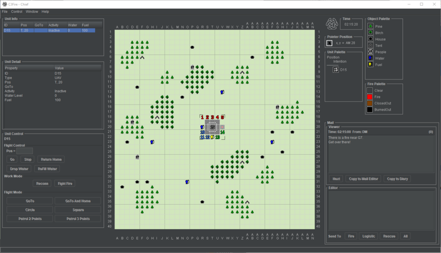 The Information Chief had access to a Drone / UAV (Unmanned Aerial Vehicle) unit that could scout the map to look for fires, houses, or civilians. The UAV is faster compared to its ground unit counterparts and can therefore cover the area faster. The UAV can also see a larger view, 5x5 squares, as opposed to the 3x3 square for all other units in the system. The UAV has several options for patrolling and can engage in different patrol patterns, such as circling a certain location and moving between different points. In this way, the Information Chief had the option of instructing the UAV to patrol certain areas autonomously and instead focus his or her efforts on instructing the other team members through the mail system.